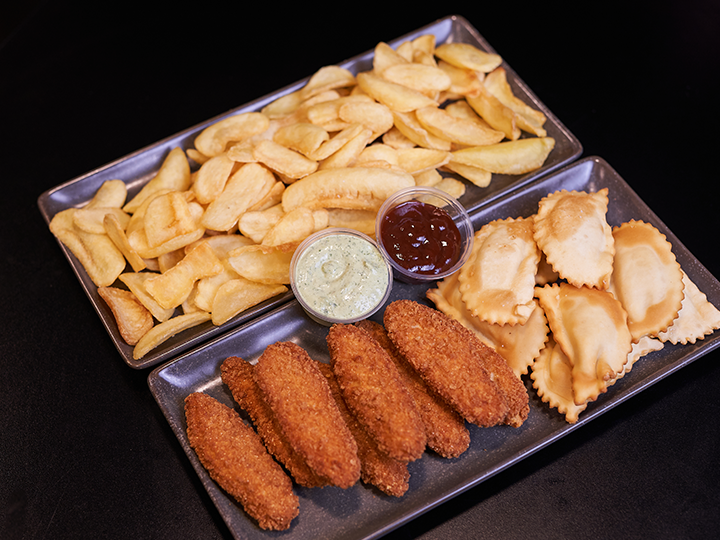 **En la foto (referencial): Chicken Fingers, Empanadas de Queso, Salsa Mayo Cilantro y Salsa BBQ.**