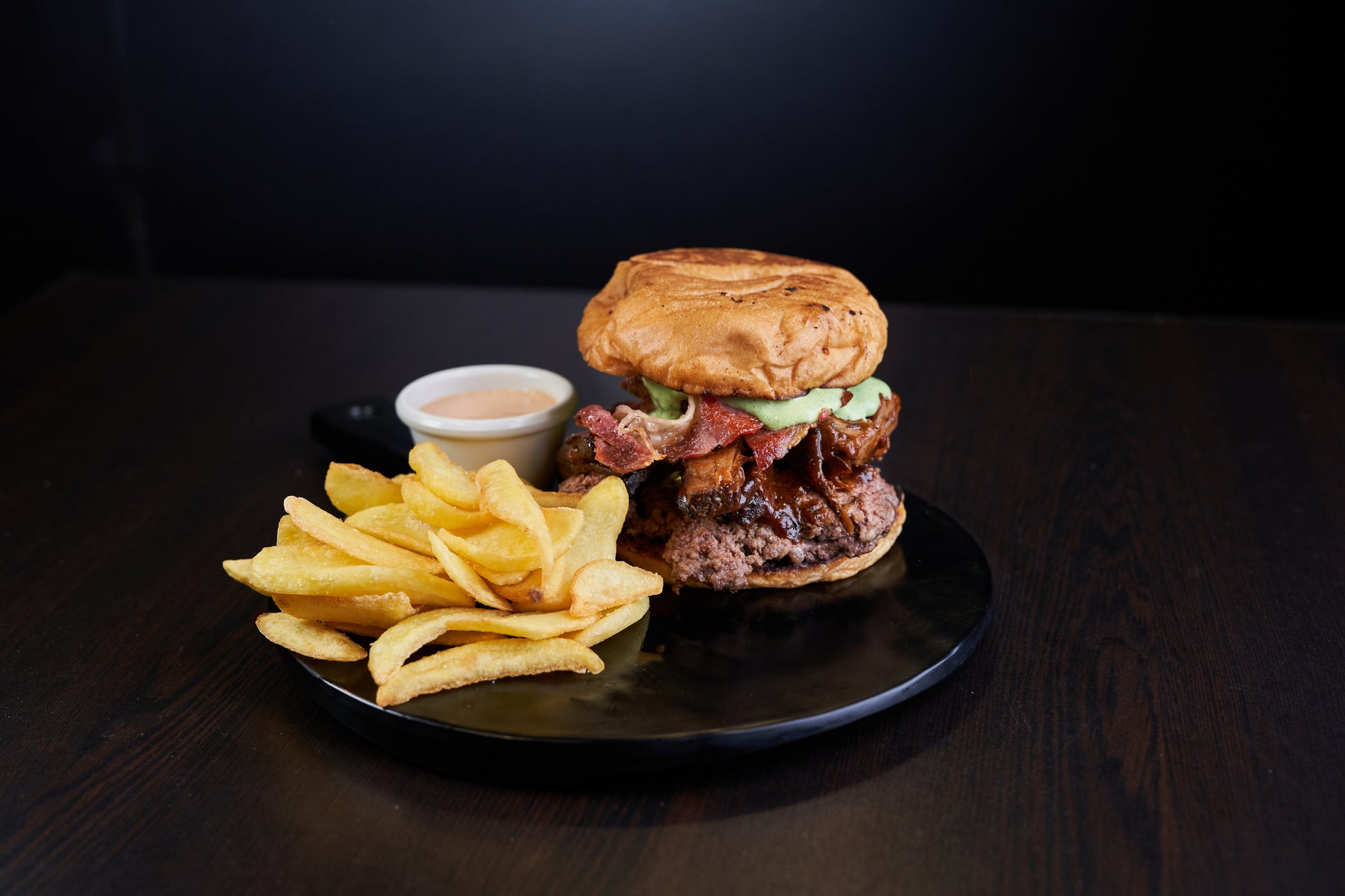 Pan de papa americano, hamburguesa 150 g, salsa de queso azul, tocino, rucula, brisket y mayo cilantro.